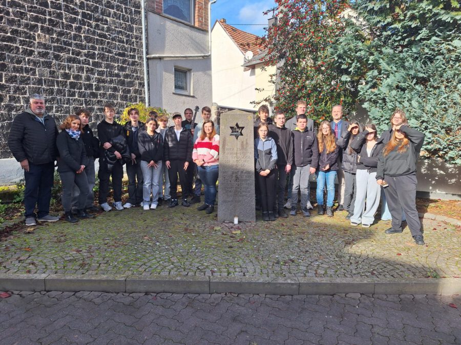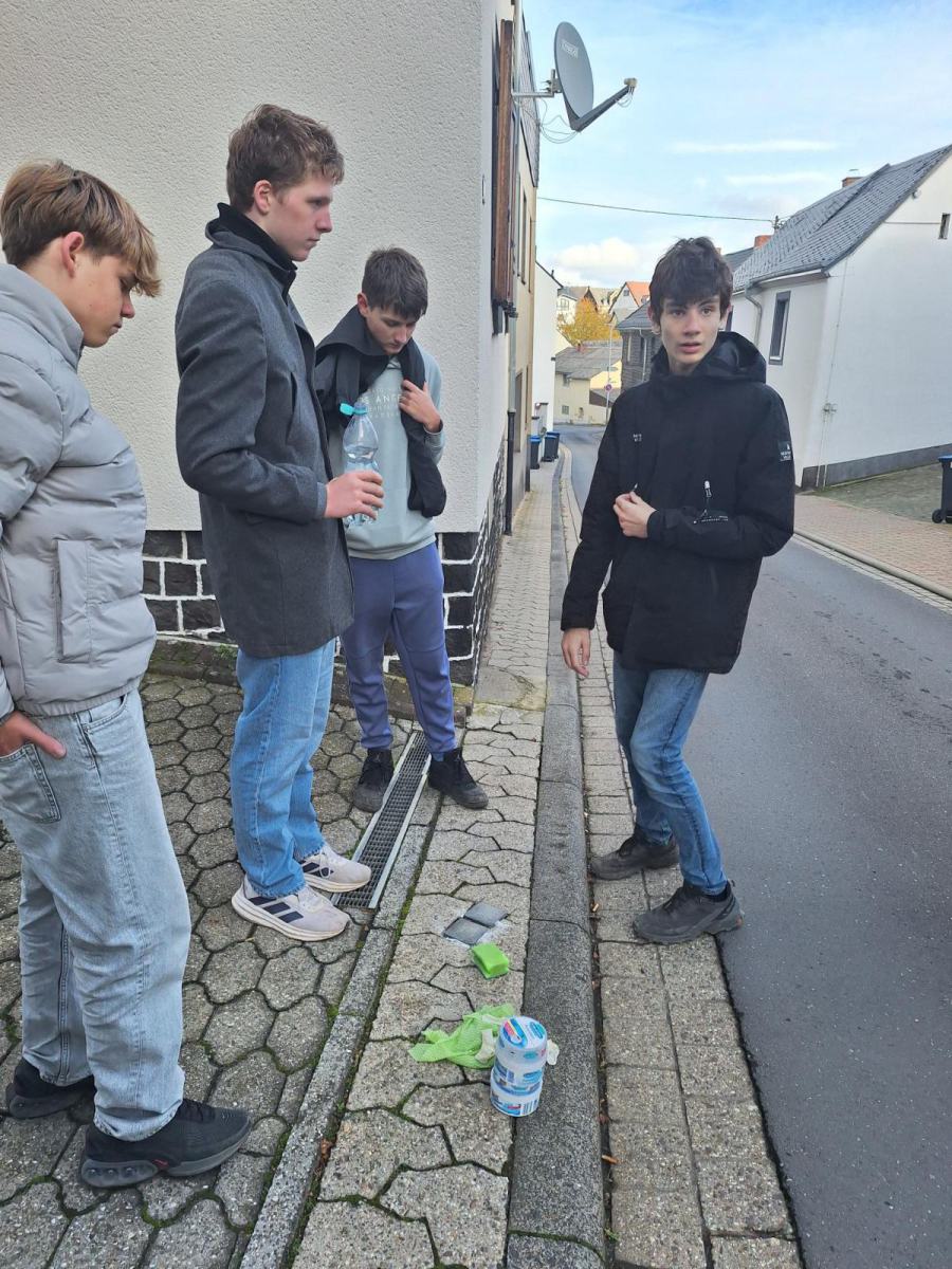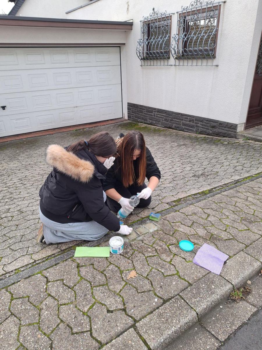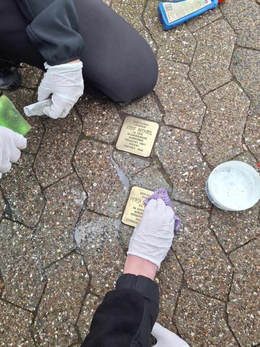 Dieses Jahr beteiligten sich 19 Schülerinnen und Schüler freiwillig an der Aktion, sie schrubbten eifrig zwei Stunden lang, bis das Messing der Steine wieder glänzte. Lara Hallfell und Jimmy Müller machten sich zusätzlich am Samstag, 08.11.25 vormittags auf den Weg und verteilten weiße Rosen auf die polierten Steine, damit sich in Mendig pünktlich zum 09.11. würdig an diese Menschen erinnert werden kann.