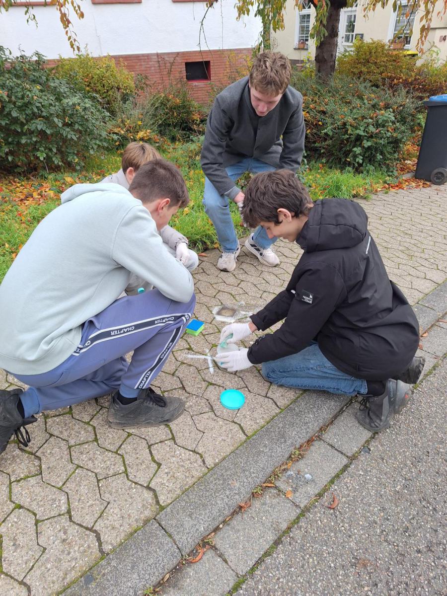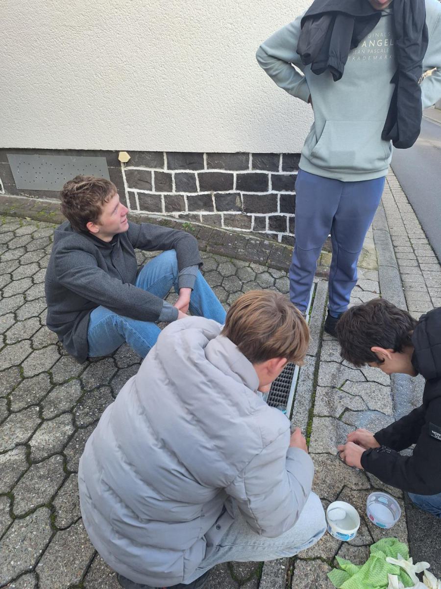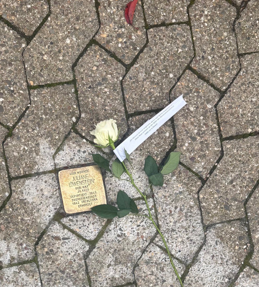 Dieses Jahr beteiligten sich 19 Schülerinnen und Schüler freiwillig an der Aktion, sie schrubbten eifrig zwei Stunden lang, bis das Messing der Steine wieder glänzte. Lara Hallfell und Jimmy Müller machten sich zusätzlich am Samstag, 08.11.25 vormittags auf den Weg und verteilten weiße Rosen auf die polierten Steine, damit sich in Mendig pünktlich zum 09.11. würdig an diese Menschen erinnert werden kann.