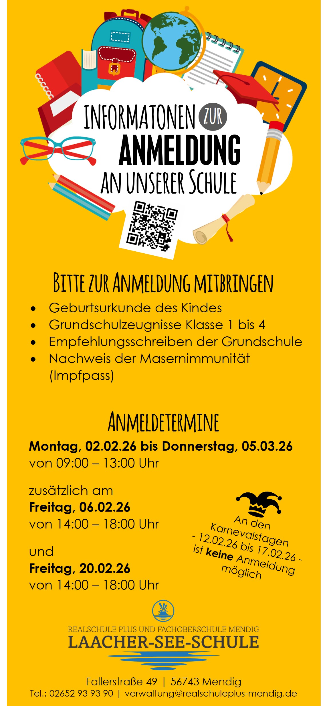 Kinder, die im Schuljahr 2026/27 die Klasse 5 der Laacher-See-Realschule plus und Fachoberschule Mendig besuchen möchten, können an folgenden Tagen im Schulsekretariat angemeldet werden.